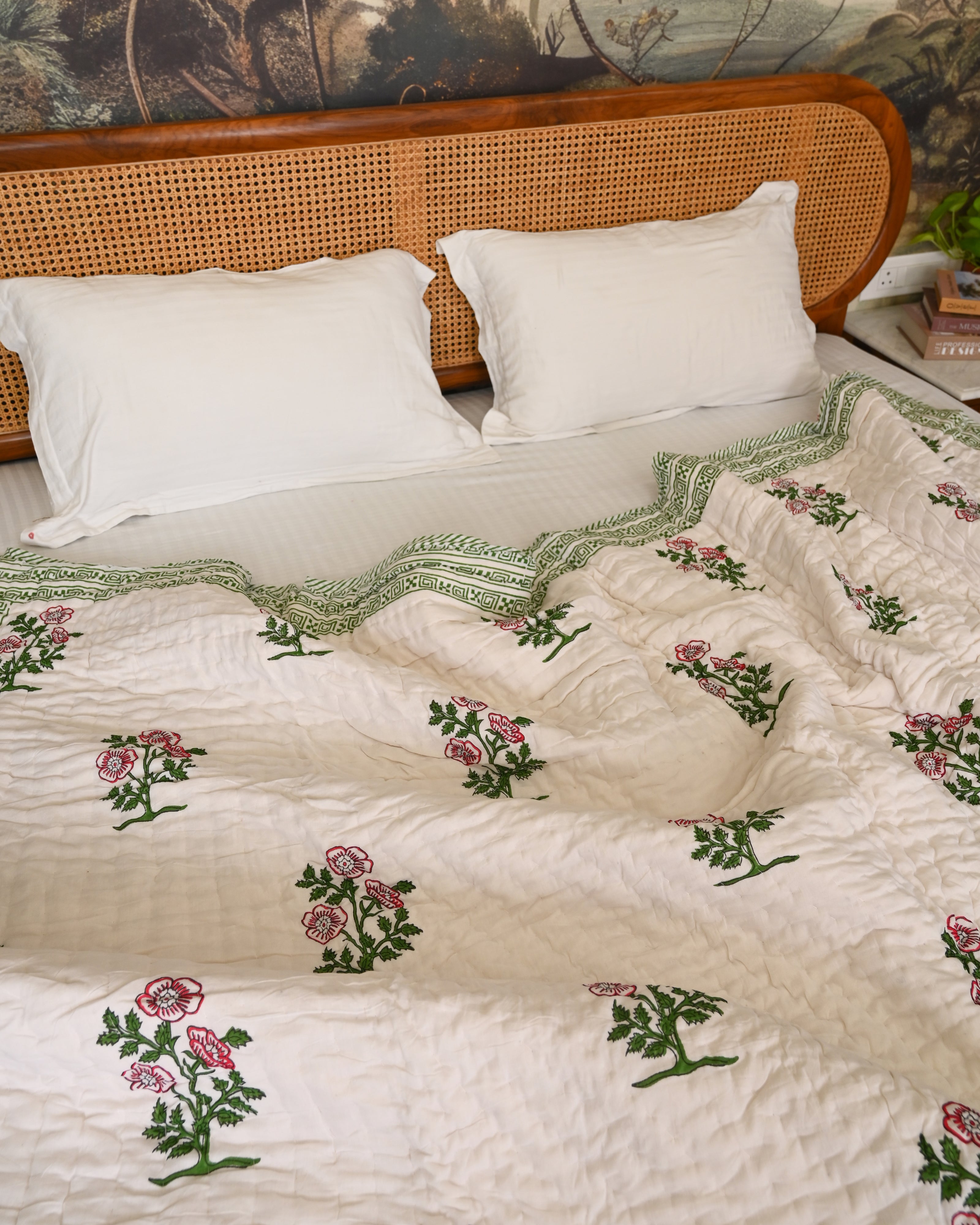 Bichhona Hand Block Printed Quilted Bedcover Set. Inspired by tranquil valley motifs, this set is crafted from premium cotton and features delicate hand block printing that effortlessly blends tradition with modern style.