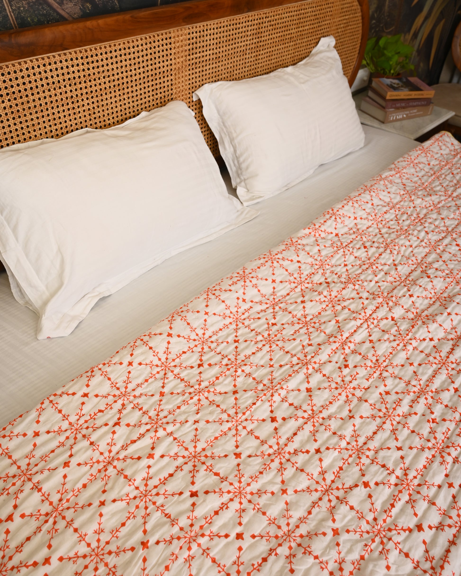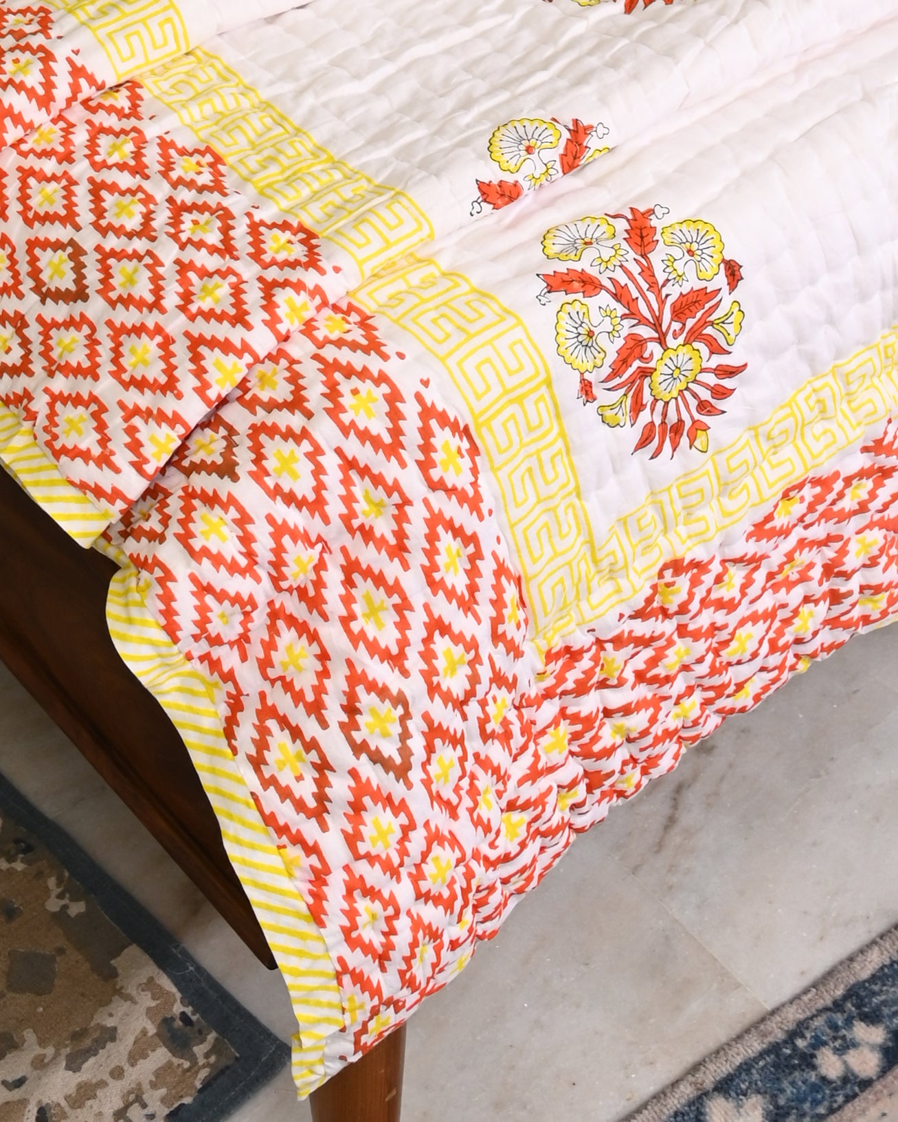 Each quilt is carefully adorned with detailed hand block prints, bringing timeless character and refined beauty to your bedroom. Reversible patterns add versatility and style, making it a perfect centerpiece for your bedding collection.