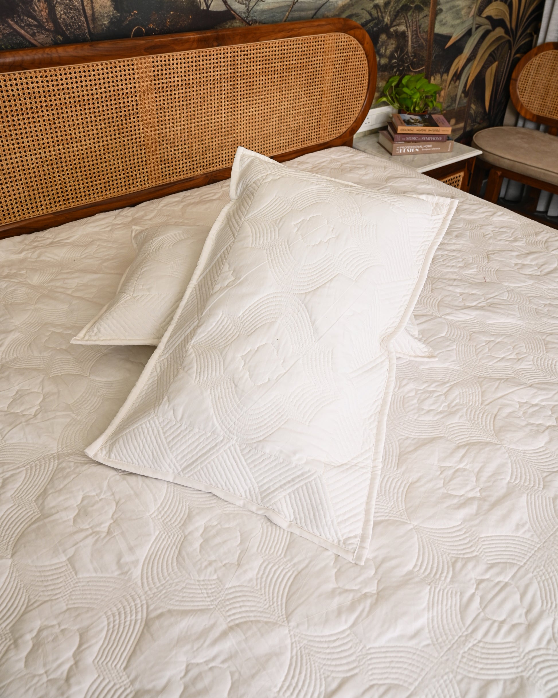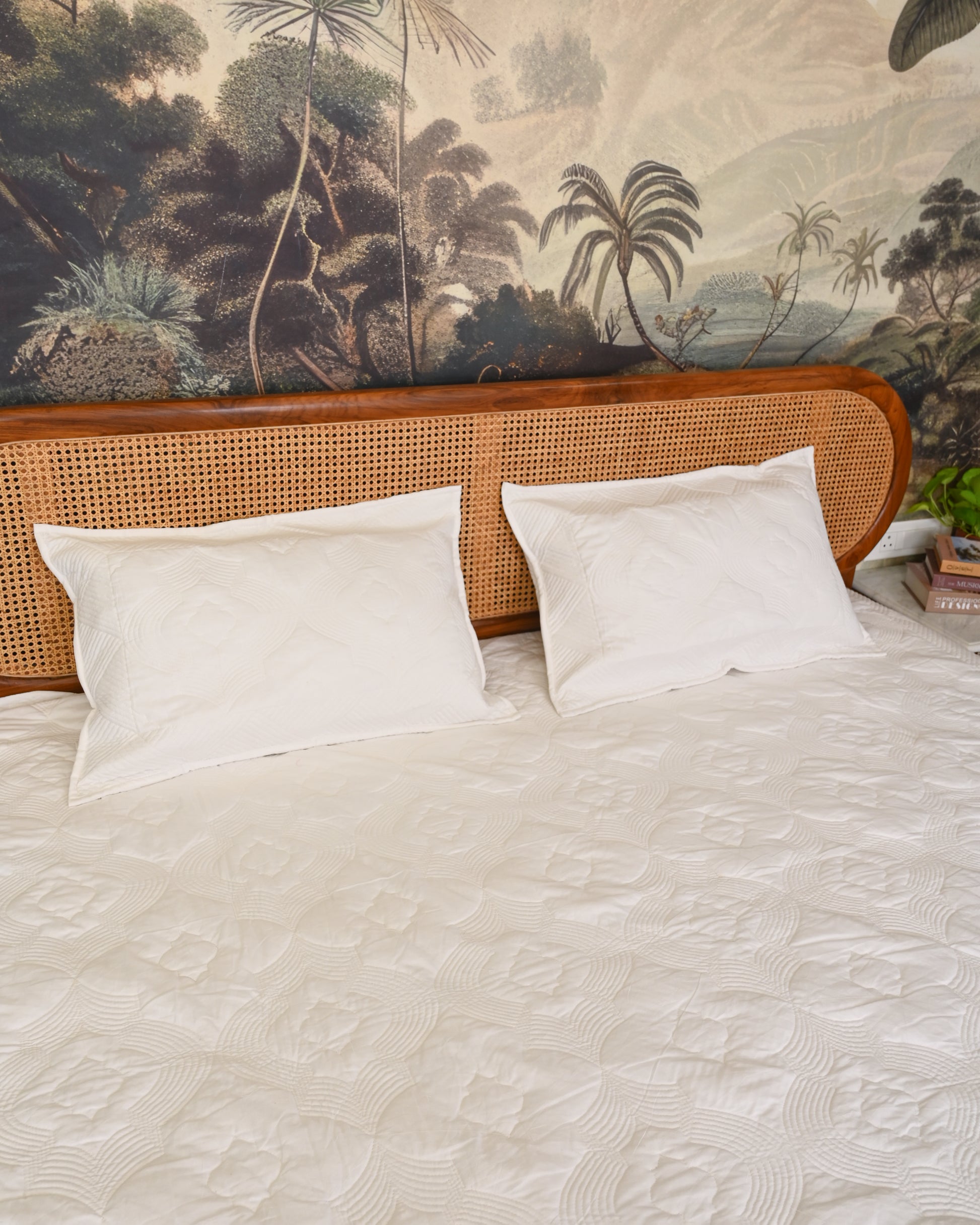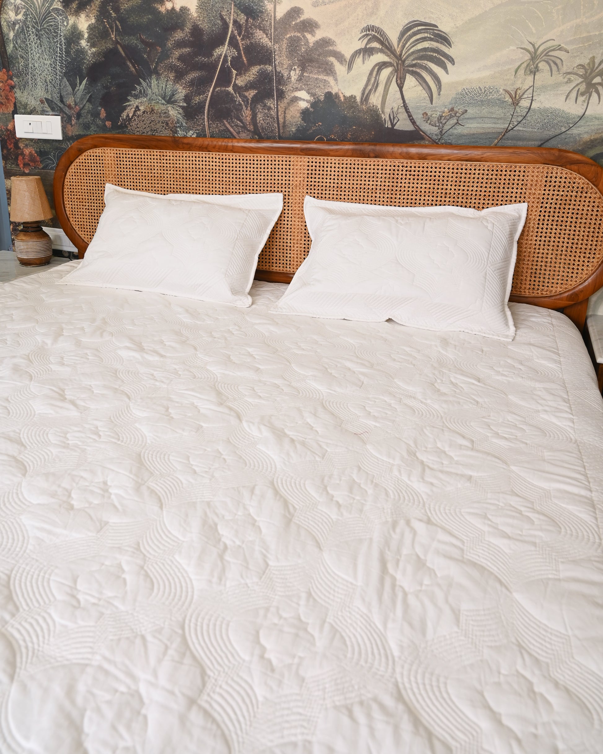 Transform your bedroom with the elegant charm of the Bichhona Hand Block Printed Quilted Bedcover Set. Inspired by tranquil valley motifs, this set is crafted from premium cotton and features delicate hand block printing that effortlessly blends tradition with modern style.