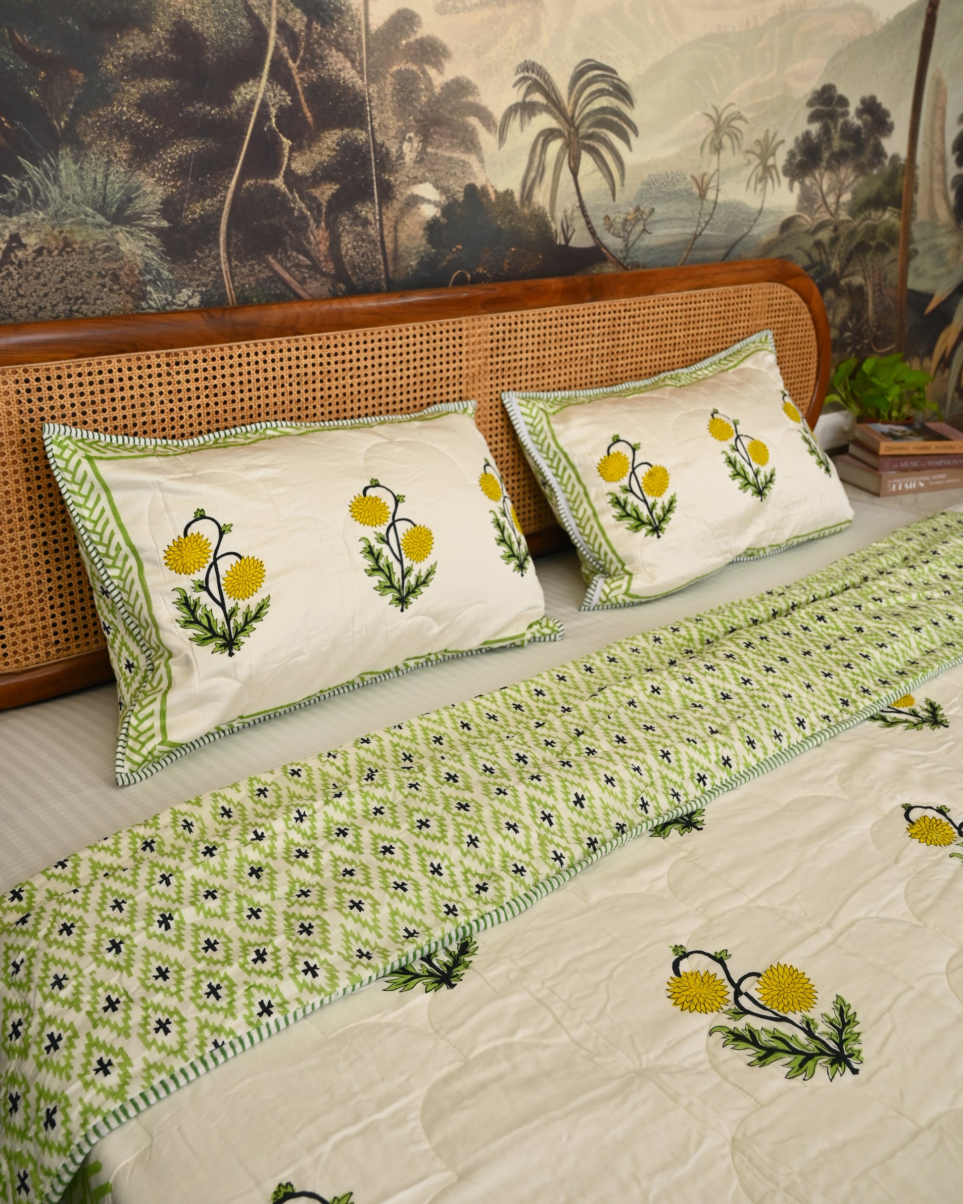 Transform your bedroom with the elegant charm of the Bichhona Hand Block Printed Quilted Bedcover Set. Inspired by tranquil valley motifs, this set is crafted from premium cotton and features delicate hand block printing that effortlessly blends tradition with modern style.