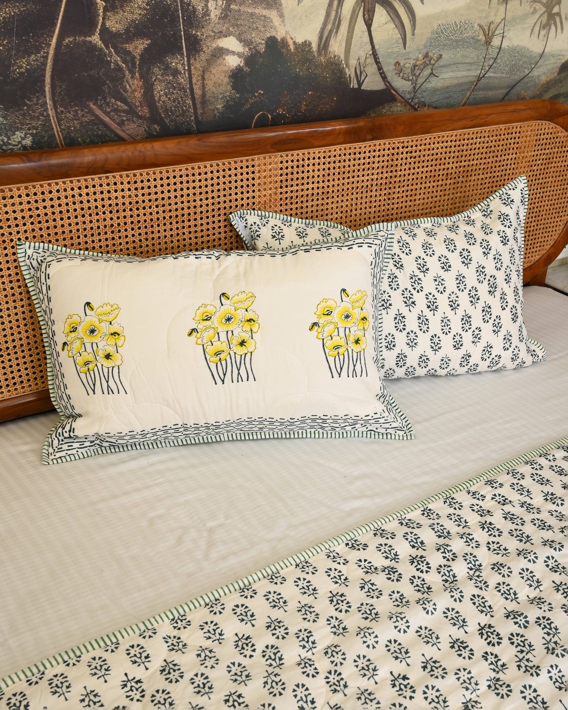 Transform your bedroom with the elegant charm of the Bichhona Hand Block Printed Quilted Bedcover Set. Inspired by tranquil valley motifs, this set is crafted from premium cotton and features delicate hand block printing that effortlessly blends tradition with modern style.